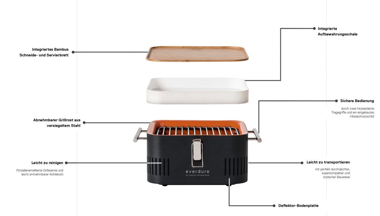 Genießen Sie echtes Holzkohlegrillen auch unterwegs mit dem tragbaren CUBE™. Dank der gut durchdachten, superkompakten Bauweise haben Sie stets alles dabei, was Sie für ein spontanes Picknick benötigen: Eine integrierte und lebensmittelechte Aufbewahrungsschale, die Bambus Arbeitsplatte zum Schneiden und Servieren Ihrer Speisen und natürlich den Grill mit porzellanemaillierter Grillwanne. Mit dem CUBE™ können Sie aufbewahren, vorbereiten, grillen und servieren. Die Chromgriffe sind von der Hitze isoliert, so dass Sie Ihren CUBE™ auch während des Grillens anfassen und bewegen können.