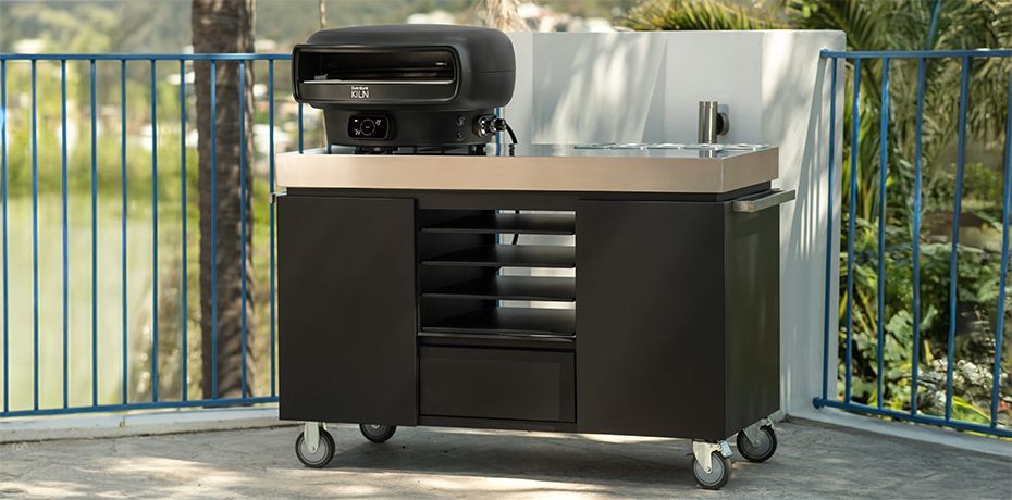 Die Pizza Station hält Zutaten organisiert und Werkzeuge griffbereit, mit robusten Edelstahloberflächen, clever verteiltem Stauraum und Rollen für einfaches Verschieben — der perfekte Begleiter für deinen tragbaren Pizzaofen oder als eigenständiges Feature.